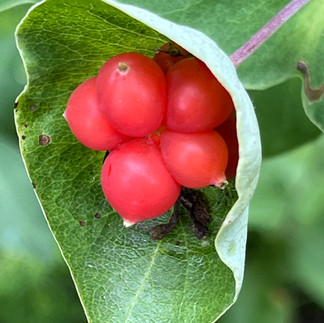 Ripe berries of twining honeysuckle (Lonicera dioica) in an Edmonton garden, also showing white-hairy underside to the connate leaves which form a cup-like cluster. 2024-08-04. Photo: P. Cotterill.