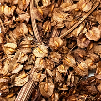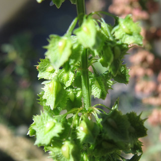 Close up of developing fruits of Tierra del Fuego dock, Rumex fueginus, showing toothed valves. A joint on the pedicel is clearly visible in the centre of the photo. Dinosaur Provincial Park, 2011-09-28. Photo: P. Cotterill.