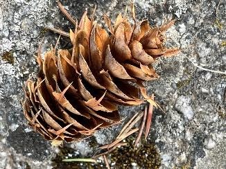 Photos from left: western redcedar; characteristic cone of Rocky Mountain Douglas-fir; whitebark pine (photo: D. Vujnovic); common juniper with “berries.” Other photos: P. Cotterill.